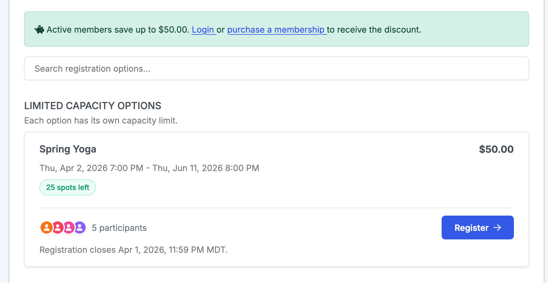 Communal offers the ability to create member-only programs that are either hidden completely from the public or require a membership to complete the registration.
