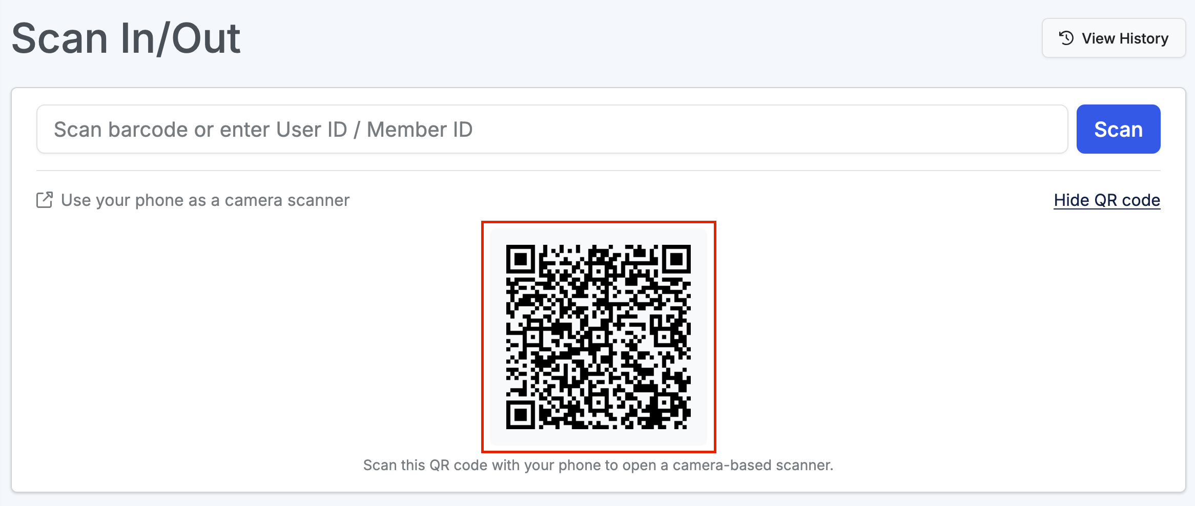 - This will then open up a scanner on your preferred mobile browser. You can then hover your device over the members QR code or barcode and click Scan