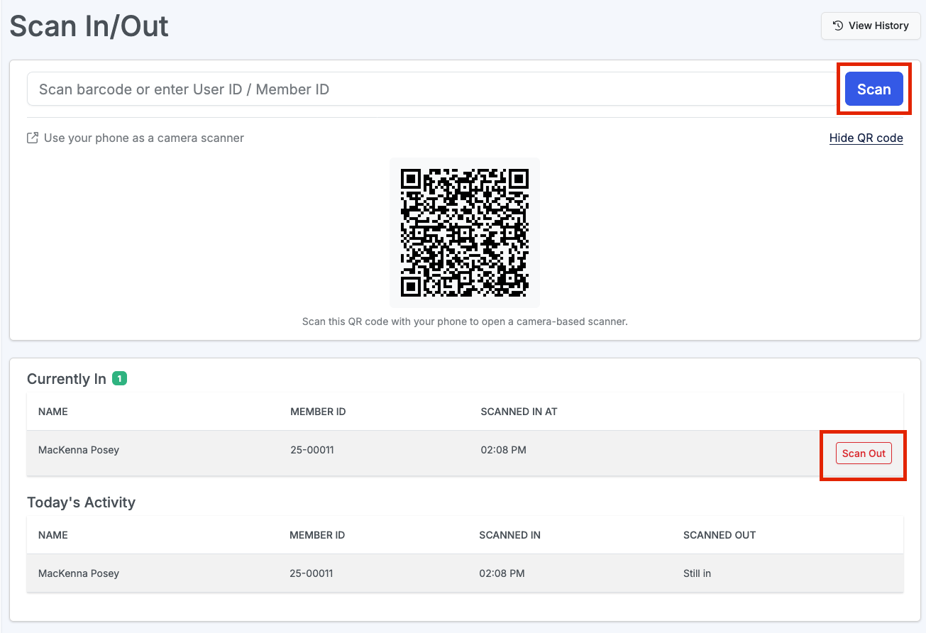 - Once on that page, enter the member's ID in the box and click Scan. This will scan the user in to your facility
