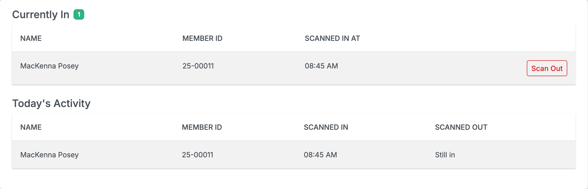 - To scan out, locate their name in the Currently In list and click Scan Out