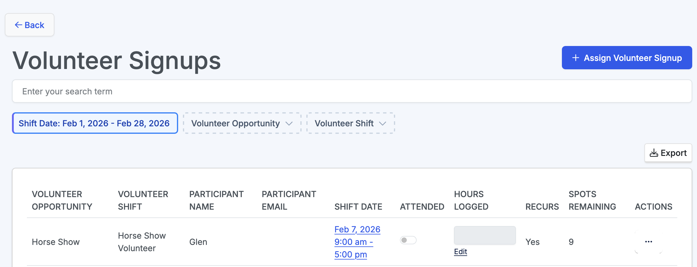 - From here you can leverage the filters to view the basic information for specific volunteer opportunities, shifts, or all signups in a certain time period. You can then view each volunteer, track who attended, and input volunteer hours.